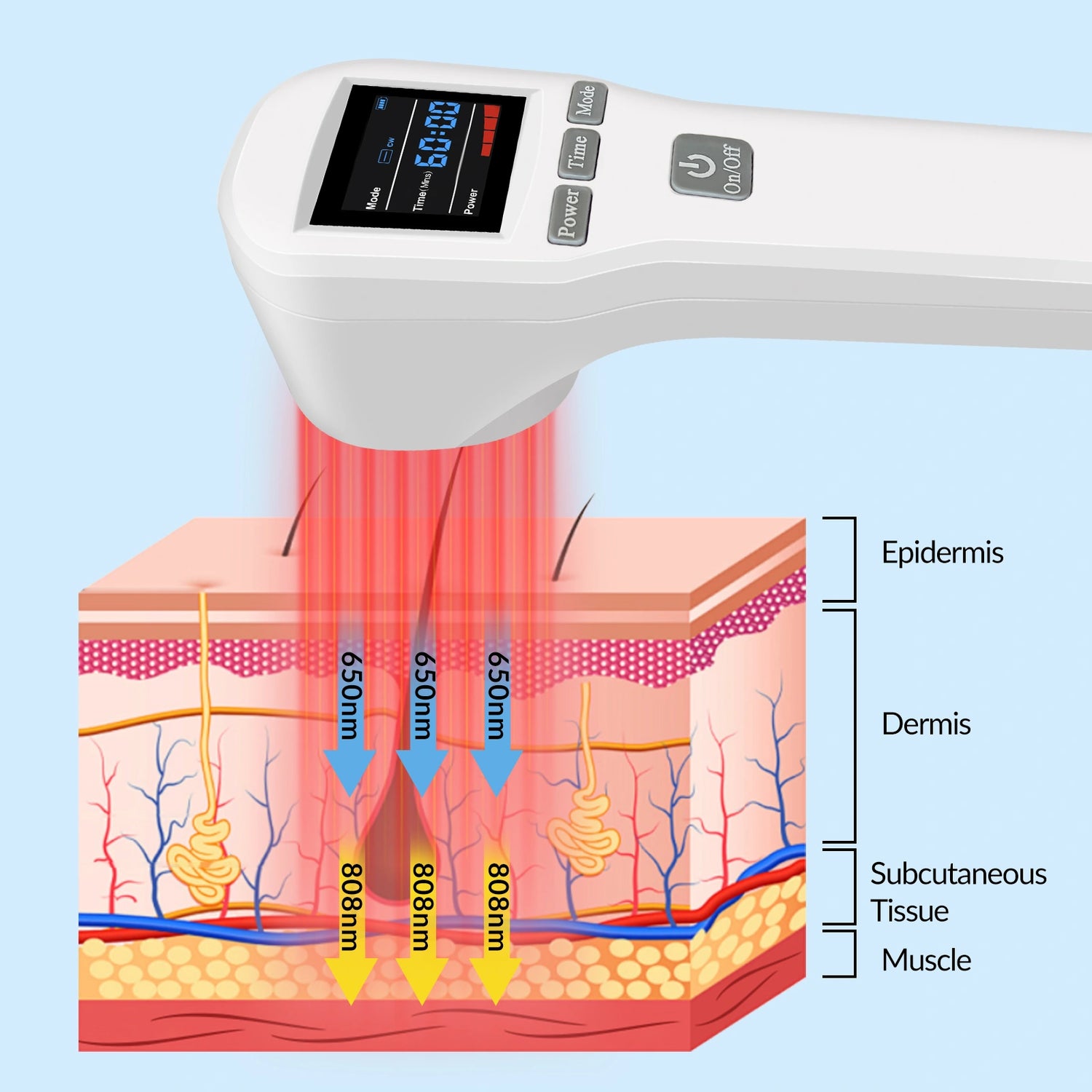 Operating at 880mW with 16x 650nm and 4x 808nm diodes, this device delivers Low-Level Laser Therapy (LLLT) through two distinct mechanisms. The Low-Level Cold Laser Therapy Device operates using Low-Level Laser Therapy to deliver specific wavelengths of light, penetrating the skin to reach tissues. This process stimulates cellular repair, reduces inflammation, and boosts circulation, aiding in pain relief and recovery.