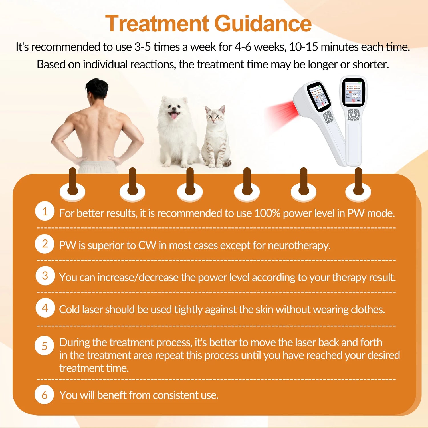 For effective pain relief, inflammation reduction, and tissue repair, use a combination of 650nm, 808nm, 905nm, and 980nm wavelengths. For chronic conditions, apply continuous wave (CW) mode; for acute pain and injuries, use pulsed wave (PW) mode at 2,500Hz. Treat for 10-15 minutes per session, 3-5 times per week. Lower power from 200-1000mW; High power from 1001mW-2500mW.