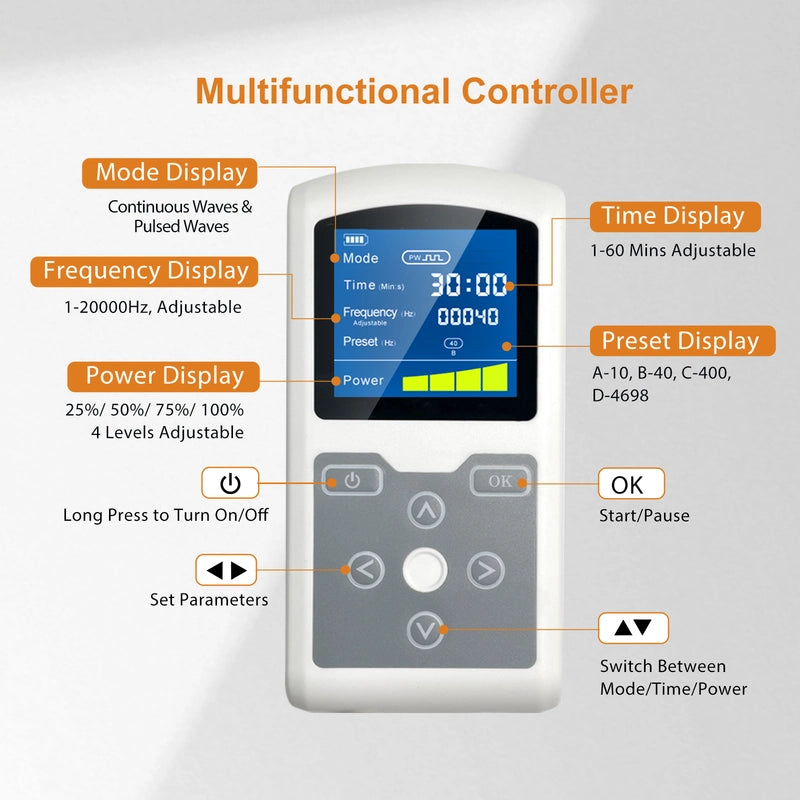 Operate via a dedicated controller to switch CW/PW modes, adjust power (25%-100%) and treatment time (1-60 mins). Choose 4 presets (10/40/400/4698Hz) or customize frequency (1-20,000Hz) for targeted PBM therapy.