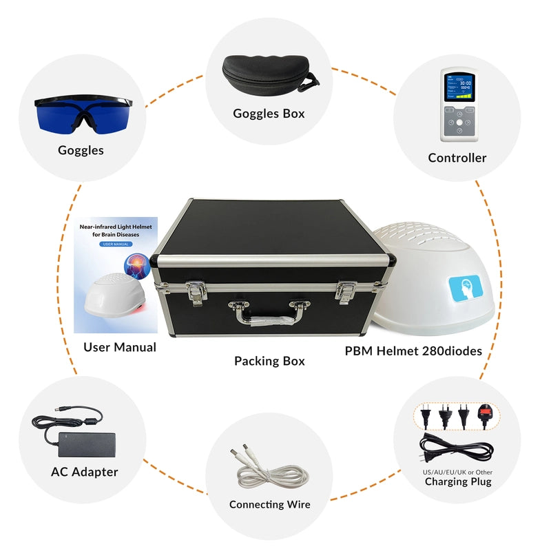 Near-infrared Light HelmetMultifunctional ControllerAC Adapter & Charging Plug (US/ AU/ EU/ UK or other, based on your region)Connecting WireGoggles + Goggles BoxPBM Helmet User ManualPacking BoxProduct Specs:Net Weight: 0.67kg (1.48lbs) Inner Depth: 11cm (4.33in)Everything you need to start your brain health journey—right out of the box.