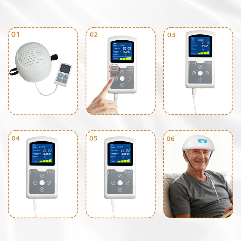 First connect the controller to the helmet, long-press the power button to turn it on or off, use the up/down buttons to select your desired mode, time, frequency or power, adjust the settings with the left/right buttons, press "OK" to start or stop the LED therapy, then put on the helmet to begin—no complicated setup, just personalized therapy in minutes.